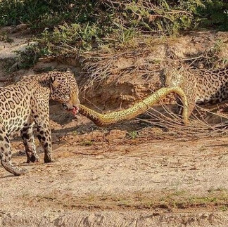 Onças-pintadas fazem "cabo de guerra" com sucuri-amarela no Pantanal